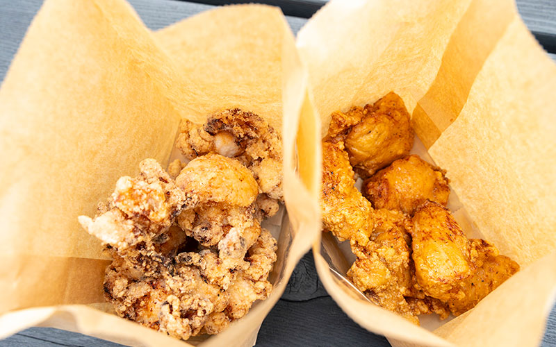 一番人気のからあげは、注文を受けてから2度揚げするこだわりぶり。味も豊富で「和風」「レモン塩」「にんにく」のほかに日替りで7種類。本店がある秋田の手作り味噌やしょっつるなど珍しい味つけも楽しめます。