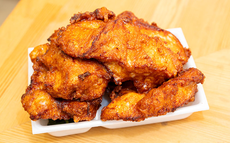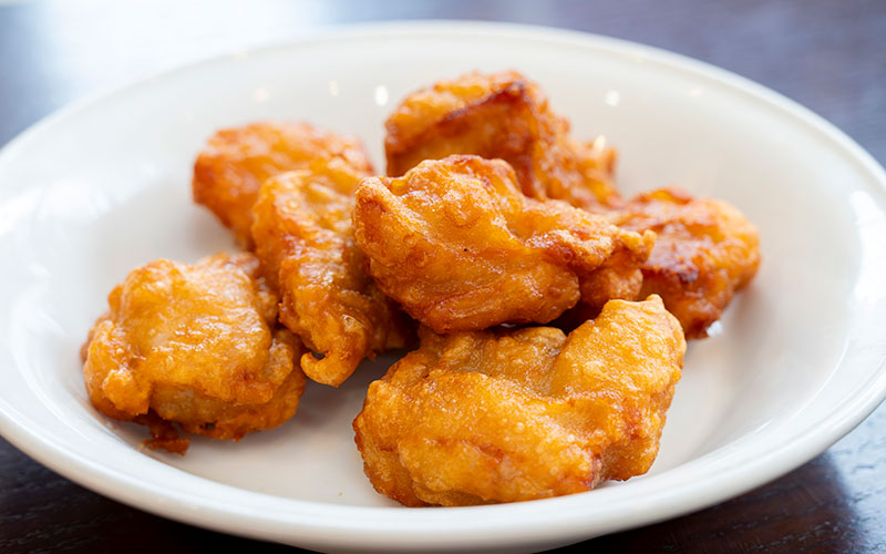 創業から地元に愛される名店。国産の胸肉を一つひとつ叩き、独自のタレに漬け込み2度揚げ。やわらかな歯応えとジュワっとあふれる、おいしい肉汁が後を引きます。「和風」「ガーリック」「チリソース」など、味変ソースも評判。